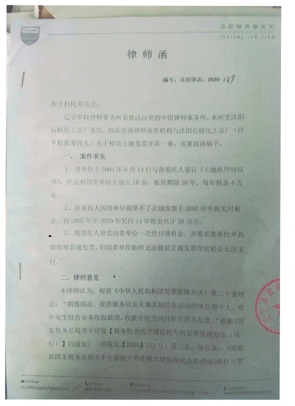 村委会对于沈阳石蜡化工总厂有限公司拖欠村委会土地租金长达十年(有沈阳石蜡化工总厂律师函为证)一事,却一直态度暧昧,甚至不闻不问,从未主张权利。即使在村民代表联名要求村委会为全体村民主张权力时,村委会仍旧裹足不前,对于委托村民代表催缴土地租金的建议也置之不理。村民们了解到,村委会之所以对催要土地租金一事不积极,是因为他们可以免费在加油站加油,存在利益分成行为。张士村民委员会已涉嫌营私舞弊、严重渎职。