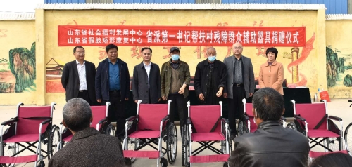 10月29日,山东省社会福利发展中心联合省假肢矫形康复中心,为省派巨野县第一书记帮扶村贫困残障群众捐赠康复辅具仪式在陶庙镇苏坑村举行。山东省社会福利发展中心理事长丁秀生,巨野县委副书记赵民,县委常委、组织部长盛冬梅、省派第一书记代表、陶庙镇领导及残障群众出席捐赠仪式。