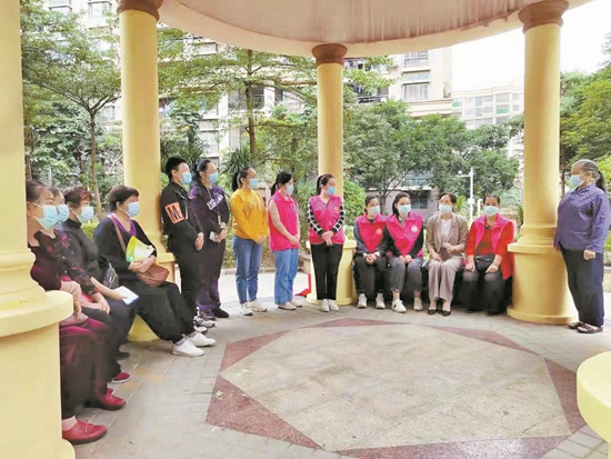 卢敏(右3)到灵山县聚龙湾小区宣讲广西妇女十四大会议精神。 均灵山县妇联提供