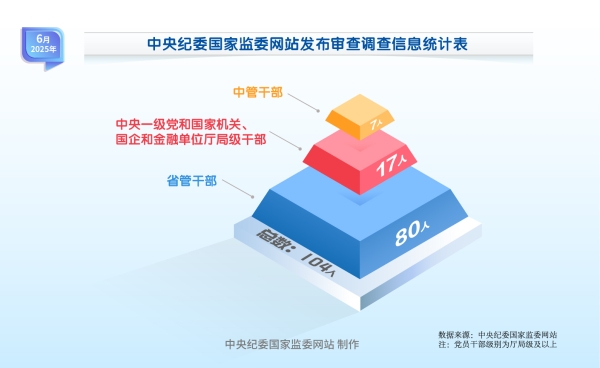 2025年6月,中央纪委国家监委网站共发布104名党员领导干部接受审查调查信息。其中,中管干部7人,中央一级党和国家机关、国企和金融单位厅局级干部17人,省管干部80人。二、发布42名党员领导干部党纪政务处分信息2025年6月,中央纪委国家监委网站共发布42名党员领导干部党纪政务处分信息。其中,中管干部5人,中央一级党和国家机关、国企和金融单位厅局级干部5人,省管干部32人。三、接受审查调查的党员领导干部多人系主动投案