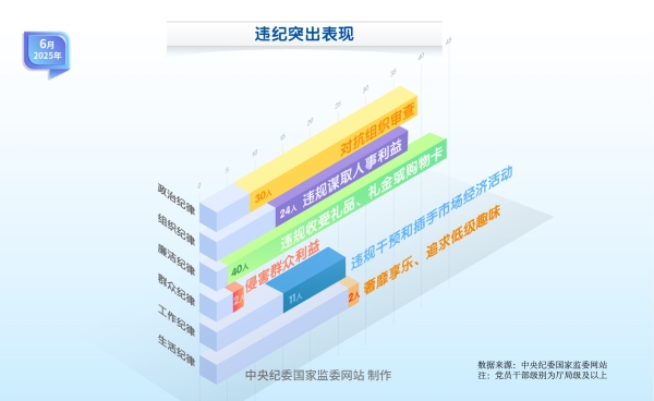 2025年6月,中央纪委国家监委网站通报的42名被处分党员领导干部中,有37人存在违反政治纪律问题,其中30人存在“对抗组织审查”行为;在违反组织纪律行为中,违规谋取人事利益占比最高;42人均存在违反廉洁纪律问题,其中存在“违规收受礼品、礼金或购物卡”行为的多达40人;违反群众纪律行为中,侵害群众利益相对突出;违反工作纪律行为中,违规干预和插手市场经济活动是突出表现。